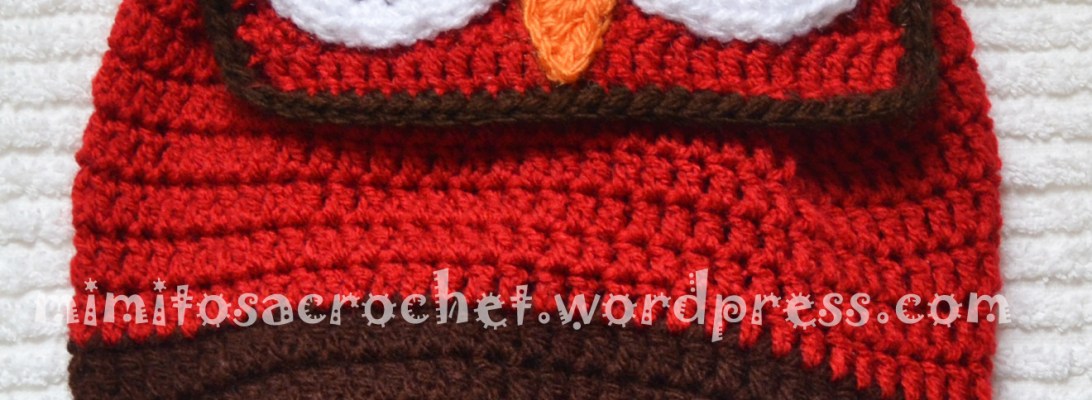 23ª VUELTA: 3 cad. * 1 vareta, 1 cadeneta, saltamos un punto de base * repetir de * a * en toda la vuelta (se queda un motivo de red que nos servirá para pasar el cordón que cierre la mochila).mochila búho detalle del cordón
