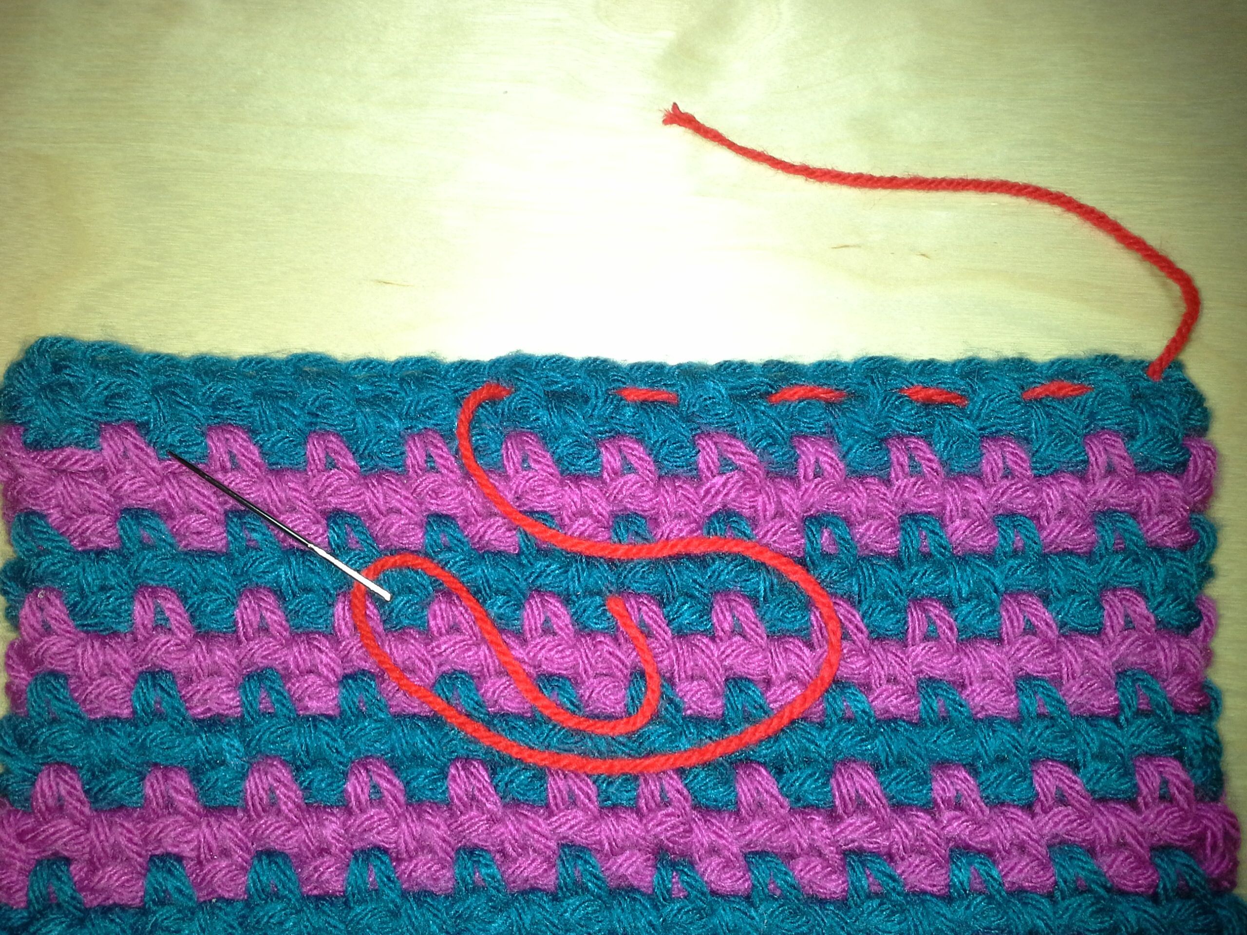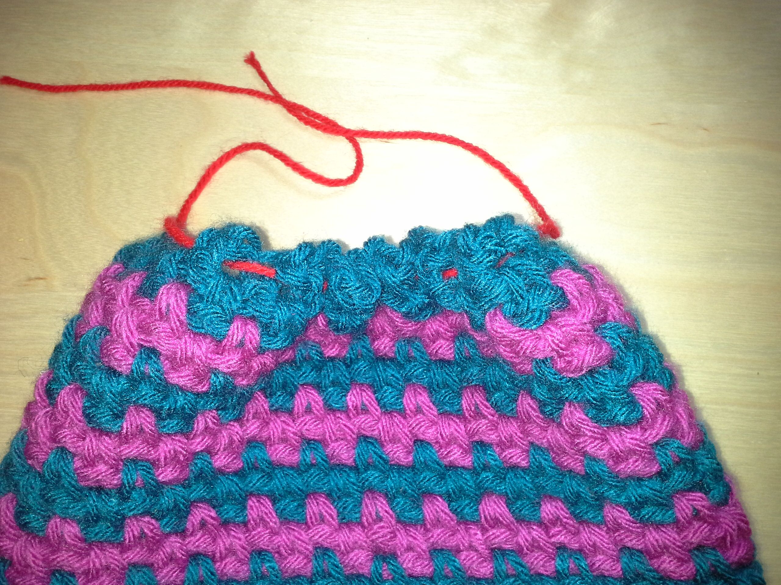 Para realizar el gorro, repetimos los mismos pasos, teniendo en cuenta que cuantas más vueltas hagamos, más caída tendrá por detrás. Al final, con una aguja lanera gordita de punta roma, y con una hebra de la lana del mismo color que el inicio, nos vamos a la cadeneta inicial y vamos a pasar la hebra con la aguja de esta manera (yo lo he hecho con una hebra de lana roja para que veáis por dónde pasa):