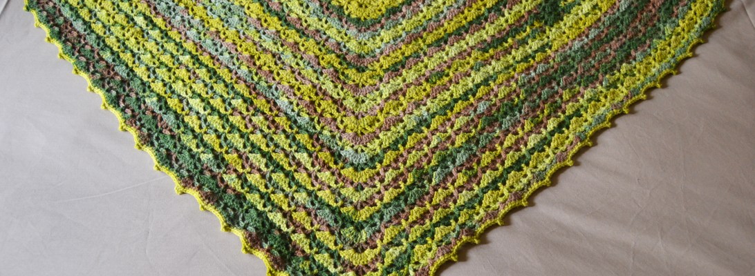 Tenía muchas ganas de terminar este proyecto para mostrároslo: este chal corto, que también podemos utilizar como pañoleta. He combinado dos características que estaba deseando probar: la lana matizada, que en este caso combina diferentes gamas de verdes y marrones, y el diseño «Elise», una combinación de puntos que crea un motivo de florecillas de cinco pétalos que me encanta.