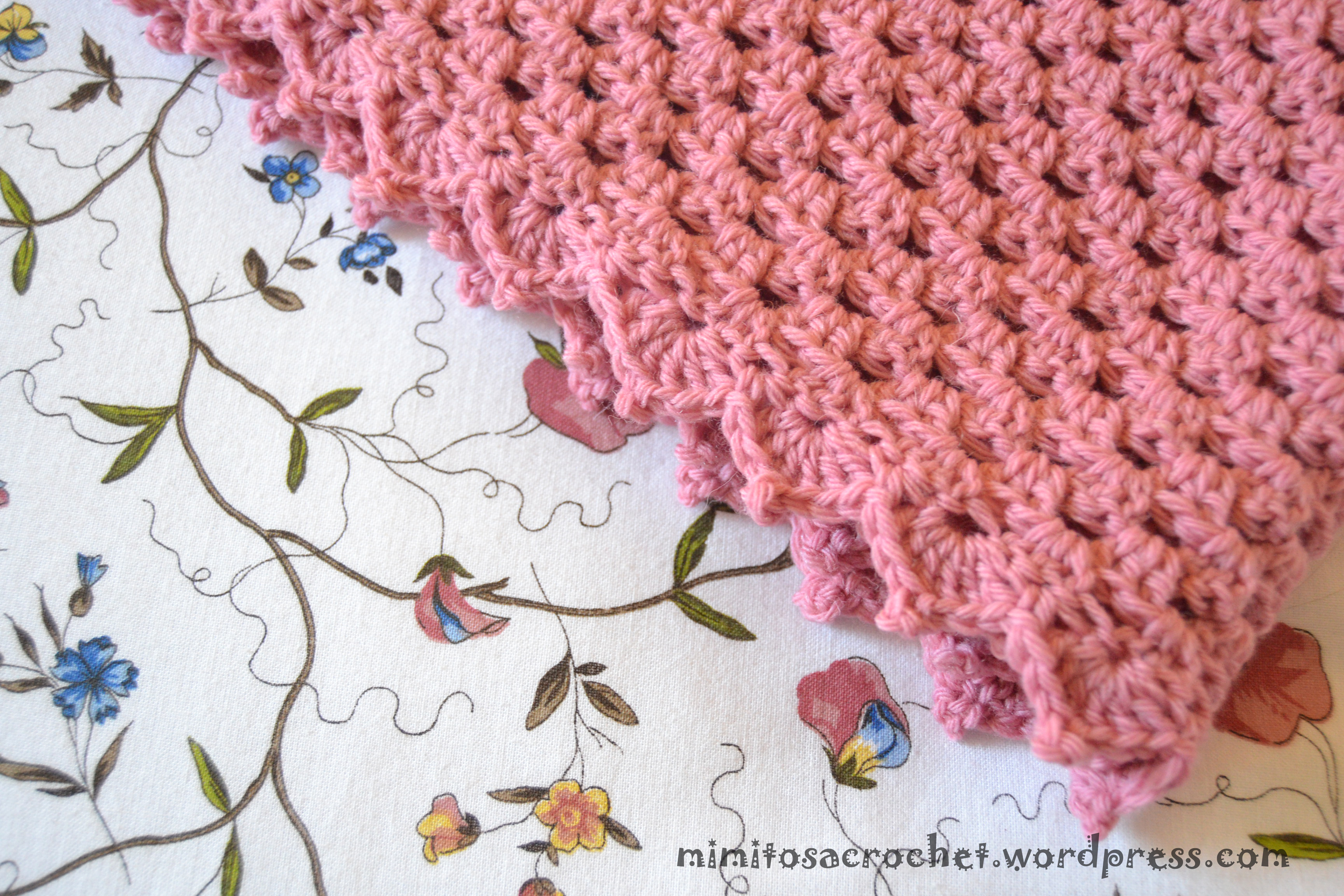 BORDE: 1 vuelta de varetas (en las esquinas hacemos [2 varetas-3 cad., 2 varetas]) con color blanco. 1 vuelta de varetas (igual que la anterior) con color rosa. La última vuelta se realiza con puntos bajos. Cada cuatro puntos bajos realizo un piquito de tres cadenetas.