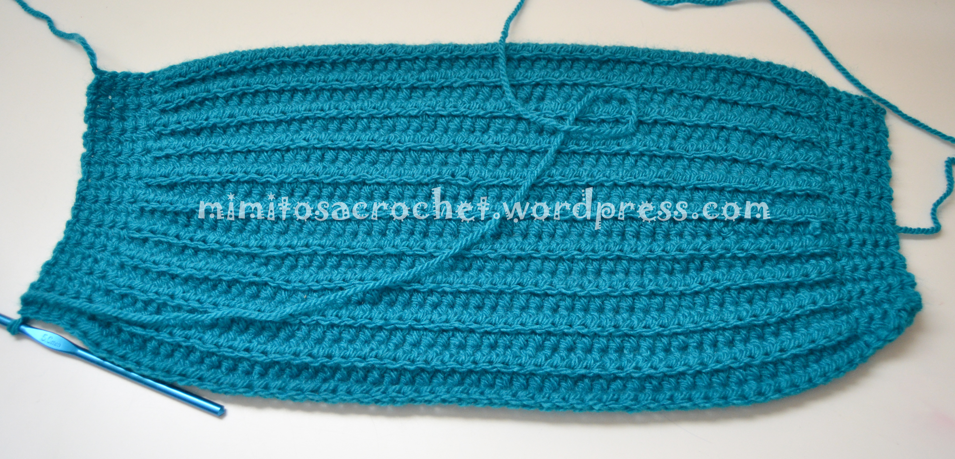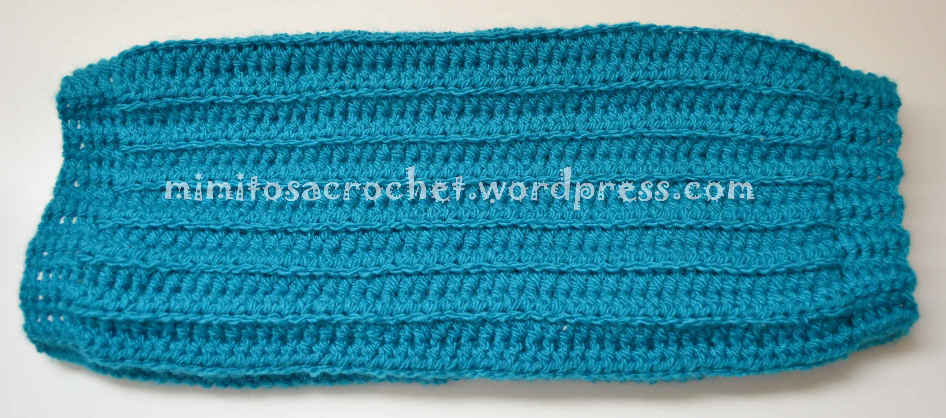 Desde la tercera vuelta y sucesivas se comienza a tejer las medias varetas tomando el bucle por detrás. Como vemos, el tejido es en horizontal, como si fuera una bufanda. Hacemos tantas vueltas como nos permitan las dos madejas que tenemos. La última vuelta, en vez de medias varetas, he realizado puntos bajos, también tomando el bucle por detrás. Una vez terminado, se deja un poquito de hilo para unir los extremos, y ¡ya tenemos listo nuestro cuello!